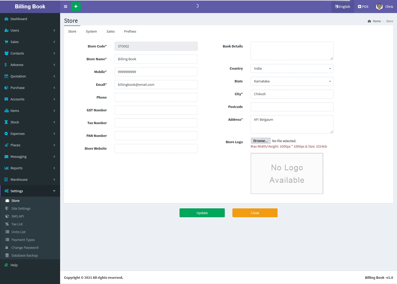 You can update the store profile information's like Store name, Phone, Mobile, Email, GST Number, VAT Number, PAN Number, Bank Details, Website link, Country, State, Postcode,Address and Invoice Logo.